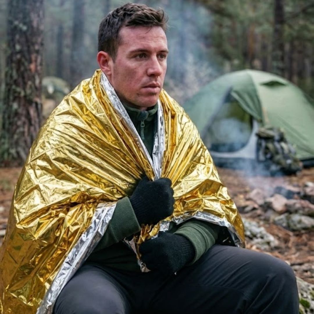 Una manta térmica de emergencia (también llamada manta isotérmica) es una lámina fina, ligera y reflectante diseñada para reducir la pérdida de calor corporal en frías noches de camping.